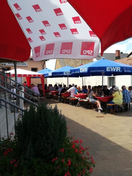 Ein Sommerfest das den Namen verdient hat, feierte die SPD Rheinhessische Schweiz am vergangenen Wochenende. Vor der Gemeindehalle in Gumbsheim war jeder Platz im Schatten belegt und die über 80 Gäste erfrischten sich mit kühlen Getränken. Aber auch das leibliche Wohl kam mit hausgemachter Currywurst und Gyros mit Pommes nicht zu kurz. Am Nachmittag wartete noch ein großes Buffet an selbstgebackenen Kuchen auf die Gäste.