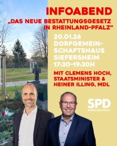 📅 Datum: 20. Januar 2026⏰ Uhrzeit: 17:30–19:30 Uhr📍 Ort: Dorfgemeinschaftshaus, Siefersheim Mit Clemens Hoch (Staatsminister für Wissenschaft & Gesundheit) und