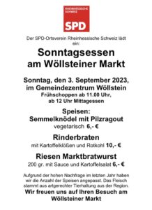Der SPD Ortsverein Rheinhessische Schweiz veranstaltet am 3.9. am Wöllsteiner Markt das „Sonntagsessen“ Wir möchten ein gutes Essen anbieten das
